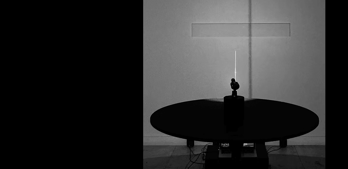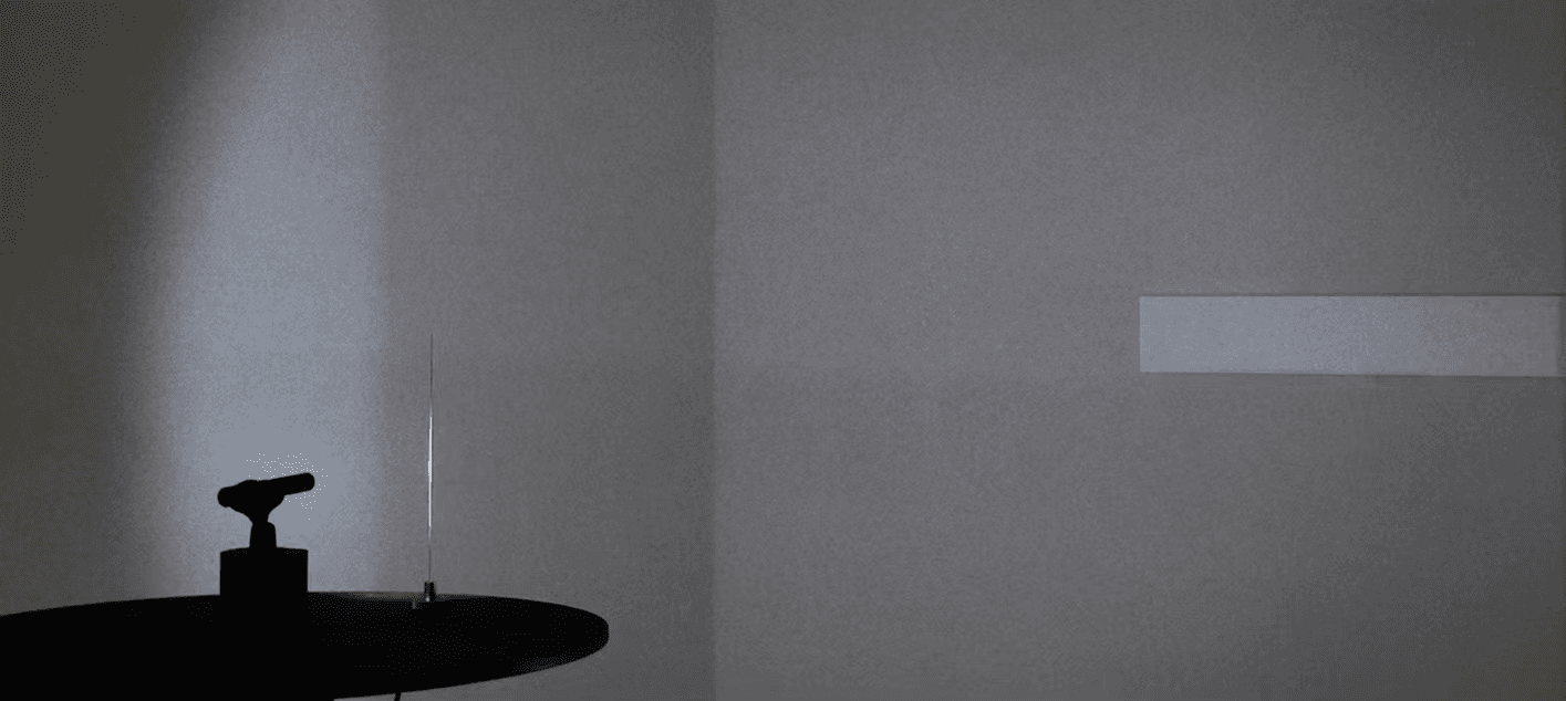 The space is in semi-darkness. Only a halo of light appears on the wall, like the circular impact of a swirling light, regularly and steadily. This intriguing moving halo is generated by a lamp, placed on a sort of pedestal table in the center of the room. This halo imprints a disc of light on the wall, moving very slowly through space, describing a revolution at constant speed.