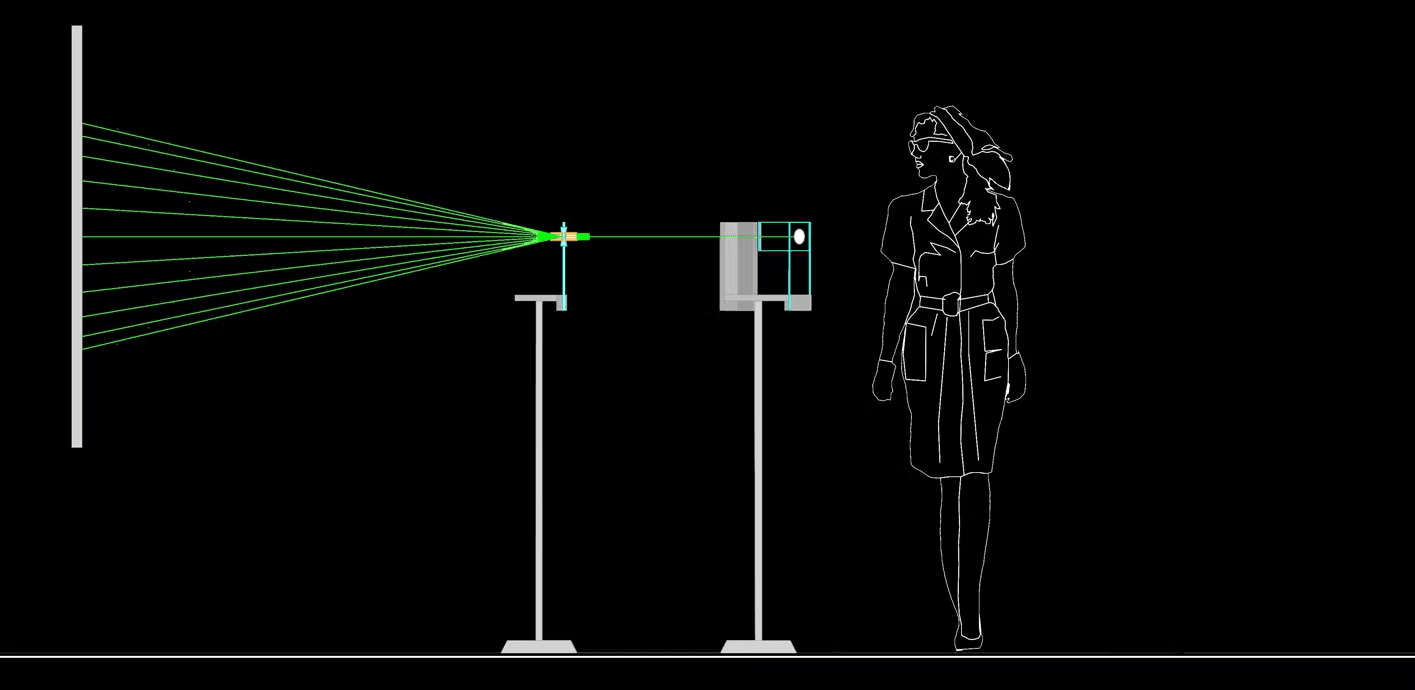 Un laser placé à 45° par rapport à l’un des miroirs est redirigé sur le centre du second. Le faisceau et ainsi renvoyé parallèlement, en retour, à travers une lentille de verre dessinant par projection des figures géométriques lumineuses lorsque que les plaques de verre vibrent, actionnées par les excitateurs audio.