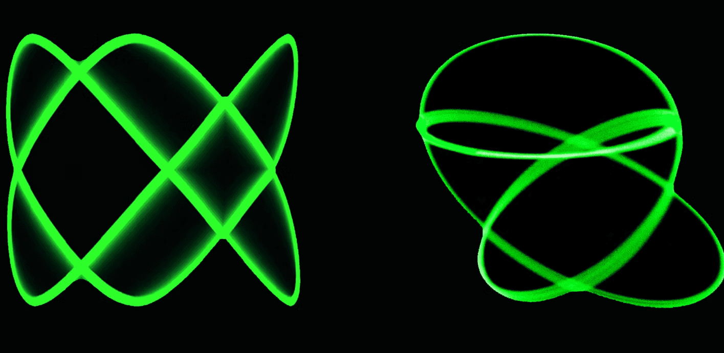 The device presented here consists of 2 Luminotones operating simultaneously, drawing 2 figures side by side, creating a kind of sonic, visual and vibratory dialogue, materialized by two luminous figures in continual transformation, like a strange geometric ballet seeking to establish an abstract dialogue of shapes and sounds.