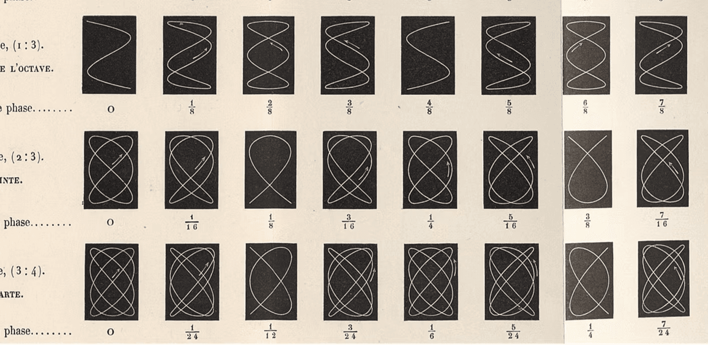 En 1883, Lissajous avait utilisé plutôt la vision, comme outil de mesure, pour accorder entre eux deux diapasons, en générant des figures optiques. Il avait pour cela disposé deux diapasons sur une table, l’un sur un plan vertical et l’autre sur un plan horizontal sur un leur support. Les branches de chaque diapason, orientées à 90 degré l’un par rapport à l’autre étaient alors équipés de petits miroirs optiques. Il plaça dans l’axe, à 45 degré du premier miroir, une forte lumière qui se reflétait dans l’autre miroir pour créer un faisceau en réfraction, visible à travers une petite lunette optique.