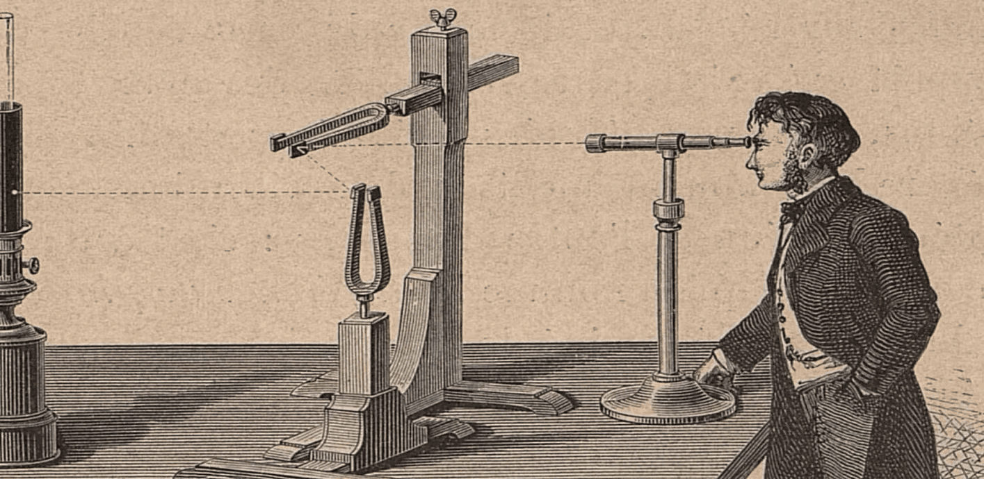 In 1883, Lissajous used vision as a measuring tool to tune two tuning forks, generating optical figures. He placed two tuning forks on a table, one on a vertical plane and the other on a horizontal plane on a support. The arms of each tuning fork, oriented at 90 degrees to each other, were fitted with small optical mirrors. He placed a strong light on the axis, 45 degrees from the first mirror, which was reflected in the other mirror to create a refracted beam, visible through a small optical telescope.